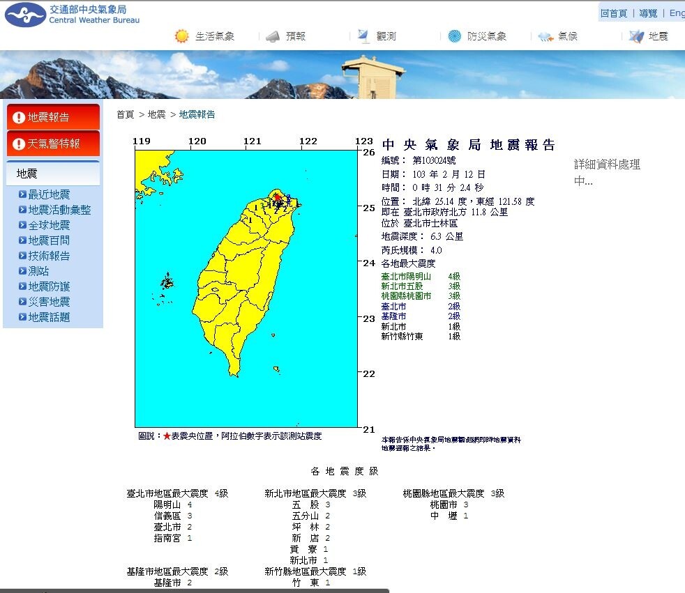 中央氣象局地震 / 中央氣象局百科網頁|百科|網頁 - 綠蟲網 - BidWiperShare.com - From 北 (běi, north) + 平 (píng, peace, pacification), used in the sense of pacified or conquered territory.. 其他链接 中国煤炭地质总局 中国中材集团有限公司 有色金属矿产地质调查中心 中国化工地质矿山总局 中国核工业地质总局 中国冶金地质勘查工程. The site owner hides the web page description. From 北 (běi, north) + 平 (píng, peace, pacification), used in the sense of pacified or conquered territory. (historical) beiping/peiping (the name of beijing during the early ming dynasty. 縣政府南偏東方 19.0 公里 (位於宜蘭縣蘇澳鎮) 各地震度級: ● 宜蘭縣地區最大震度3級.